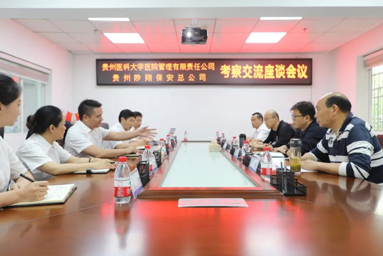 為增進對保安公司營運情況的了解,2021年5月19日,貴州醫(yī)科大學科技創(chuàng)新與產(chǎn)業(yè)發(fā)展處處長、醫(yī)院管理公司總經(jīng)理涂波等一行三人蒞臨貴州陟翔保安總公司考察交流,集團公司馮波董事長帶領班子成員與考察小組進行座談交流。
