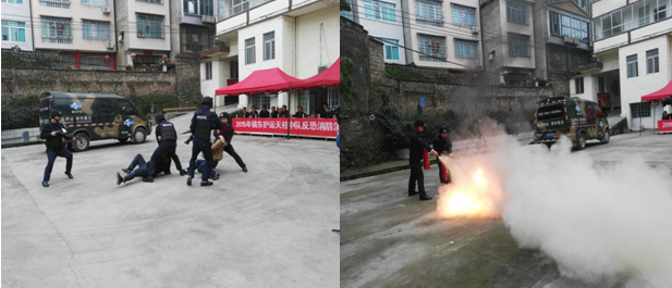 2015年12月11日,鎮(zhèn)東護(hù)運(yùn)有限公司黔東南州分公司組織天柱守押中隊(duì)在農(nóng)行大院舉行年終訓(xùn)練成果匯報(bào)暨反恐消防演練,并邀請了縣公安局治安大隊(duì)、縣銀監(jiān)局、縣人民銀行、縣工行、縣農(nóng)行、縣建行、縣電視臺(tái)等單位參加和觀看。訓(xùn)練成果匯報(bào)內(nèi)容主要包括反恐演練、隊(duì)列和擒敵術(shù)。反恐演練模擬運(yùn)鈔車在網(wǎng)點(diǎn)送鈔時(shí),押運(yùn)員遭遇歹徒徒手搶槍;運(yùn)鈔車網(wǎng)點(diǎn)收鈔時(shí),解款員提箱返回上車過程中遭遇歹徒持刀搶劫;消防演練科目主要是如何正確使用滅火器。