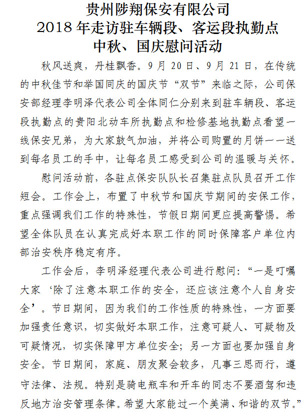 > 貴州陟翔保安有限公司 2018年走訪駐車輛段、客運(yùn)段執(zhí)勤點(diǎn) 中秋、國(guó)慶慰問活動(dòng)