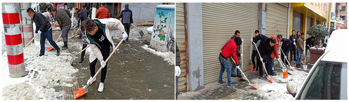 上午10點(diǎn),員工們頂著風(fēng)雪,陸續(xù)來到公司。在項(xiàng)目部張總的帶領(lǐng)下,大家不畏嚴(yán)寒,揮舞著鐵鍬開始對(duì)縣城風(fēng)雨橋附近的人行道及斑馬線的積雪和結(jié)冰進(jìn)行清掃。大家你追我趕,齊心協(xié)力,配合默契,鏟的鏟、推的推、掃的掃,干的熱火朝天,不亦樂乎,忙碌的身影構(gòu)成了一道亮麗的風(fēng)景線。雖然室外溫度很低,但大家勞動(dòng)的熱情和團(tuán)結(jié)的力量讓這個(gè)冬日變得格外溫暖。